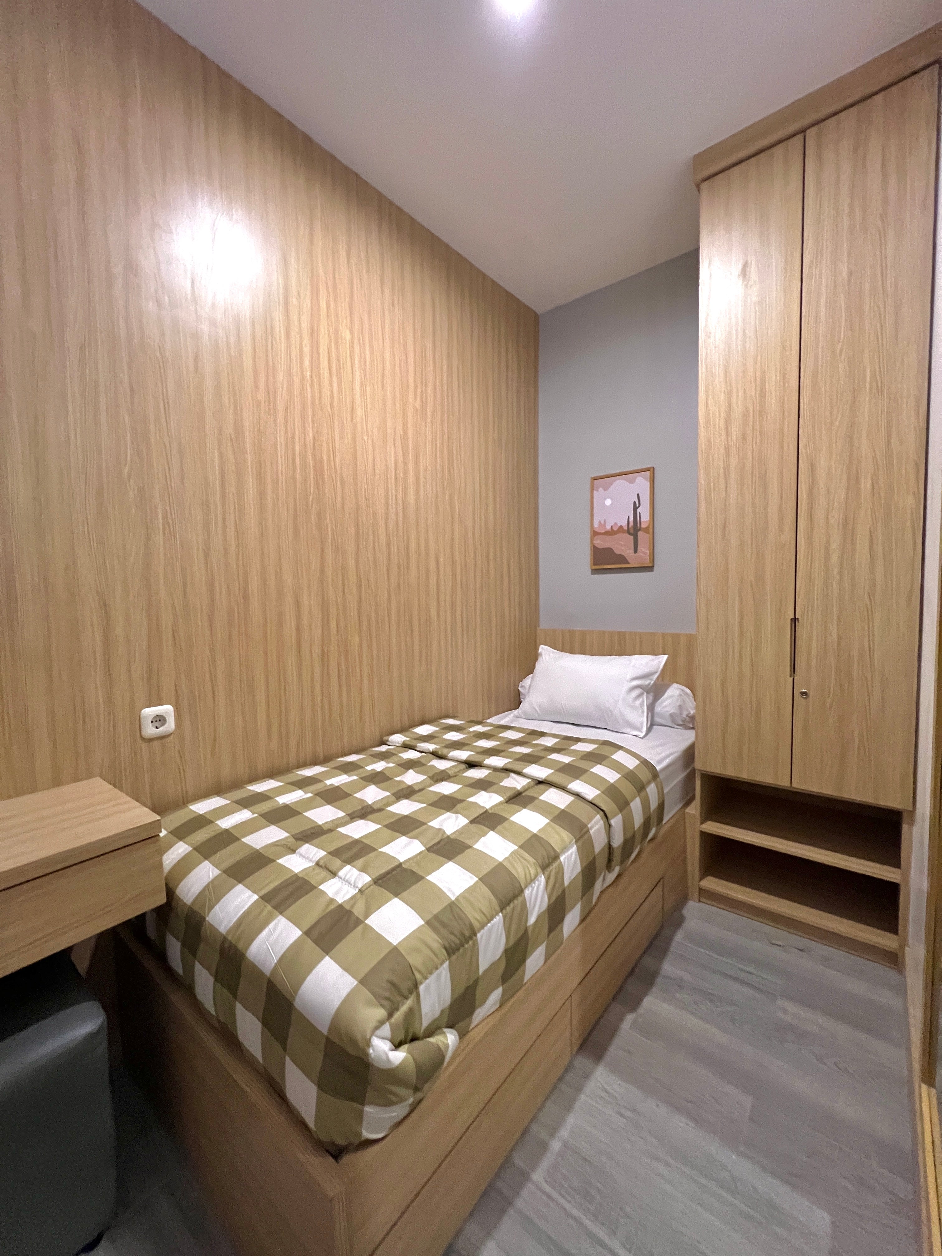 Setiap kamar menampilkan desain minimalis yang ramping, lengkap dengan tempat tidur dan smart TV. Selain itu, Anda dapat menikmati area umum dan dapur bersama untuk menambah kenyamanan.